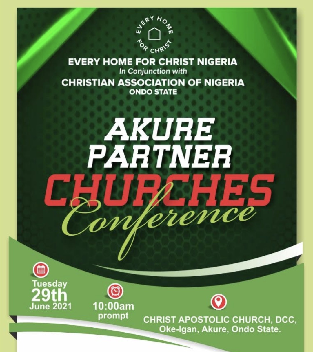 Every Home for Christ Nigeria in conjunction with the Christian Association Of Nigeria (CAN) Tuesday 29th June 2021 10:00am prompt VENUE CHRIST APOSTOLIC CHURCH, DCC Oke-lgan Akure, Ondo State.